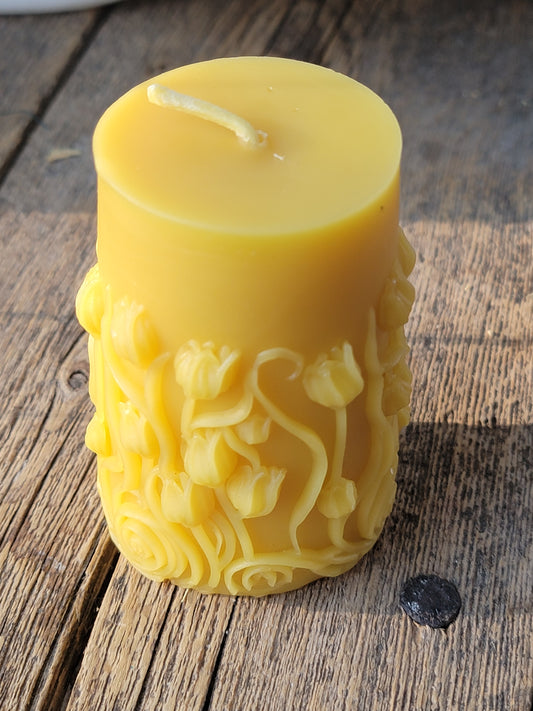 Frilly Carnation Pillar | Floral Beeswax Candle