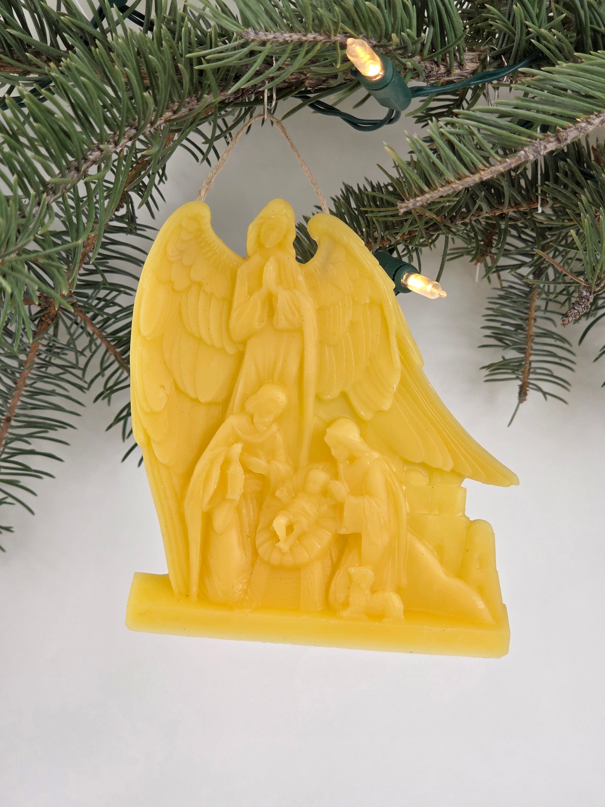 Choose between unscented natural yellow beeswax or our wonderfully fragrant antiqued cinnamon finish. Both have a twine loop for hanging. Yellow has no added scent, but retains its subtle honey aroma. Antiqued cinnamon is made with tinted beeswax and cinnamon oil, with a ground cinnamon rub on the surface. Store in a cool place. Store cinnamon ornaments in an airtight bag between seasons of use to preserve the scent.