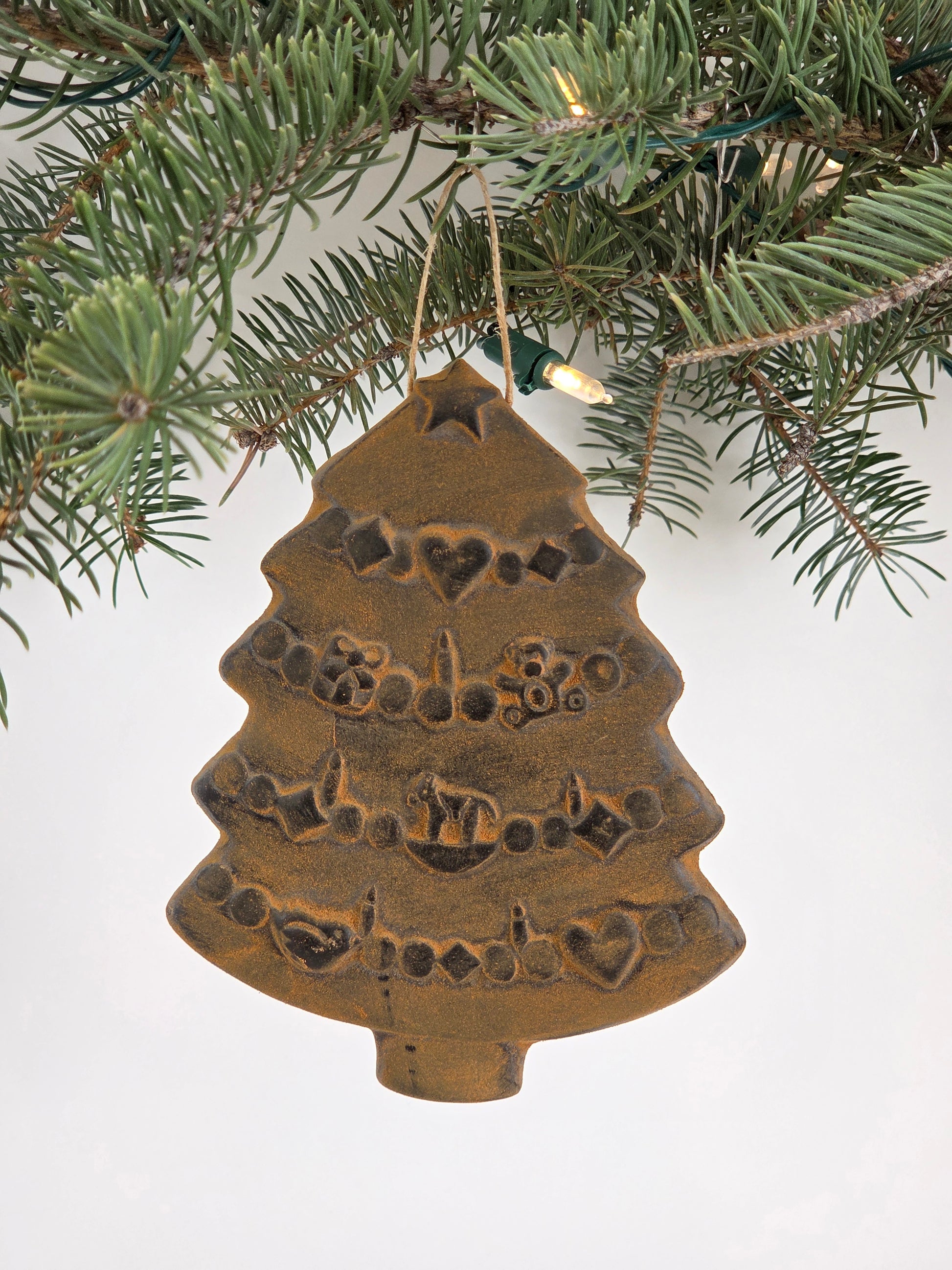 Choose between unscented natural yellow beeswax or our wonderfully fragrant antiqued cinnamon finish. Both have a twine loop for hanging. Yellow has no added scent, but retains its subtle honey aroma. Antiqued cinnamon is made with tinted beeswax and cinnamon oil, with a ground cinnamon rub on the surface. Store in a cool place. Store cinnamon ornaments in an airtight bag between seasons of use to preserve the scent.