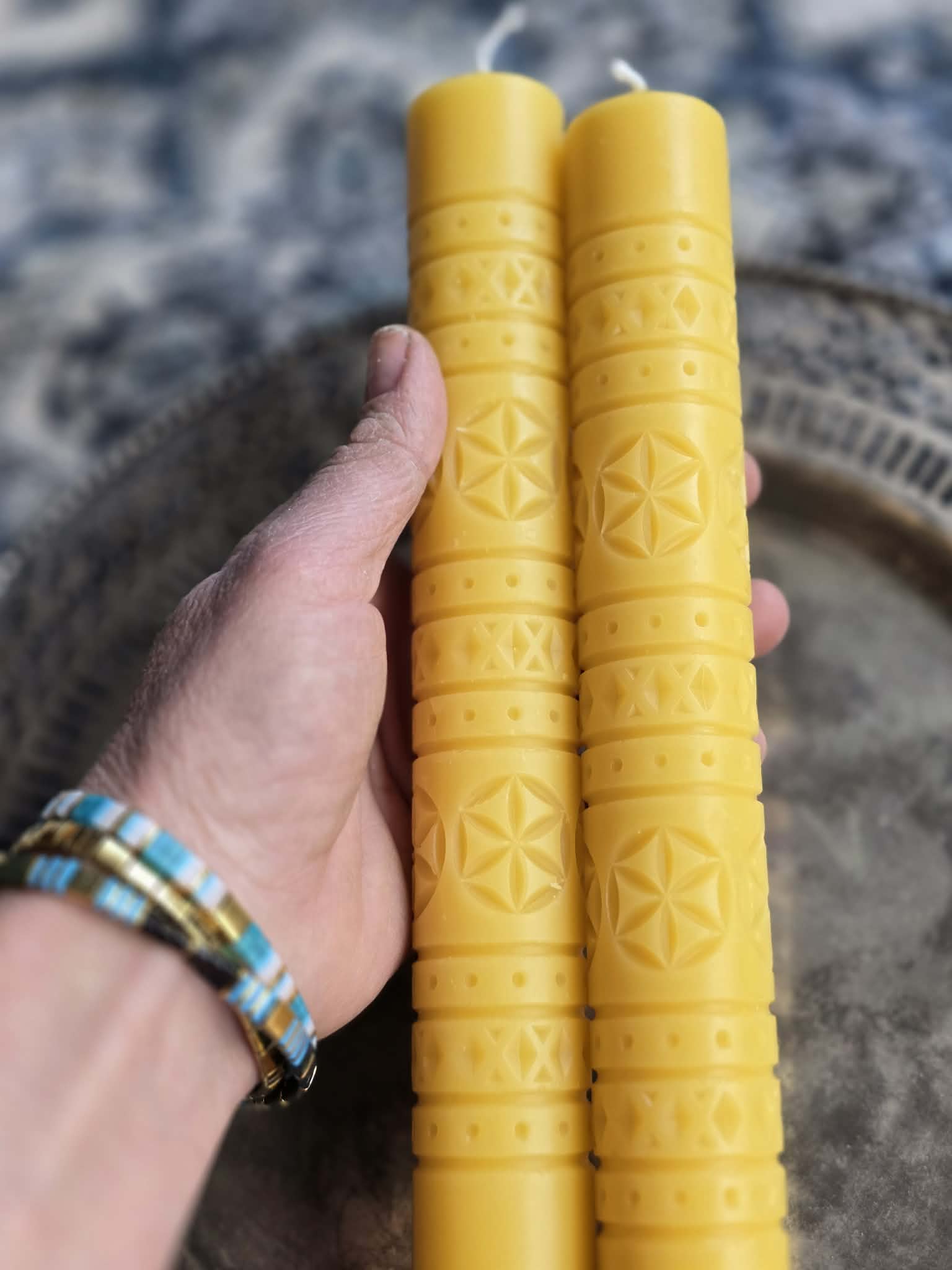 This beautiful candle speaks to me of the beauty of a lasting friendship. Buy a pair and give one to your best friend! These pillars are very tall and narrow and do best with candle holders with a pin that pokes into the bottom of the candle to stabilize it.