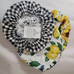 Reversible, 100% cotton bowl covers with a stretchy elastic edge. These fit great on a variety of sizes of mixing bowls, serving bowls, and stand mixer bowls. They fit best on bowls with a diameter of between 6 and 12 inches. Cover your salad, fruit, salsa bowl, plate of cookies or bowl of cookie dough, a melon, fresh bread or the pasta salad you're taking to family dinner.Â