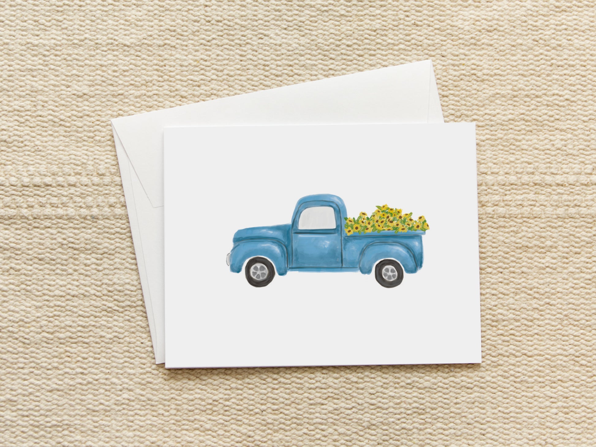 This charming vintage truck has a load of cheerful sunflowers to brighten your day. Write a thank you note, a birthday card, or a message just because.