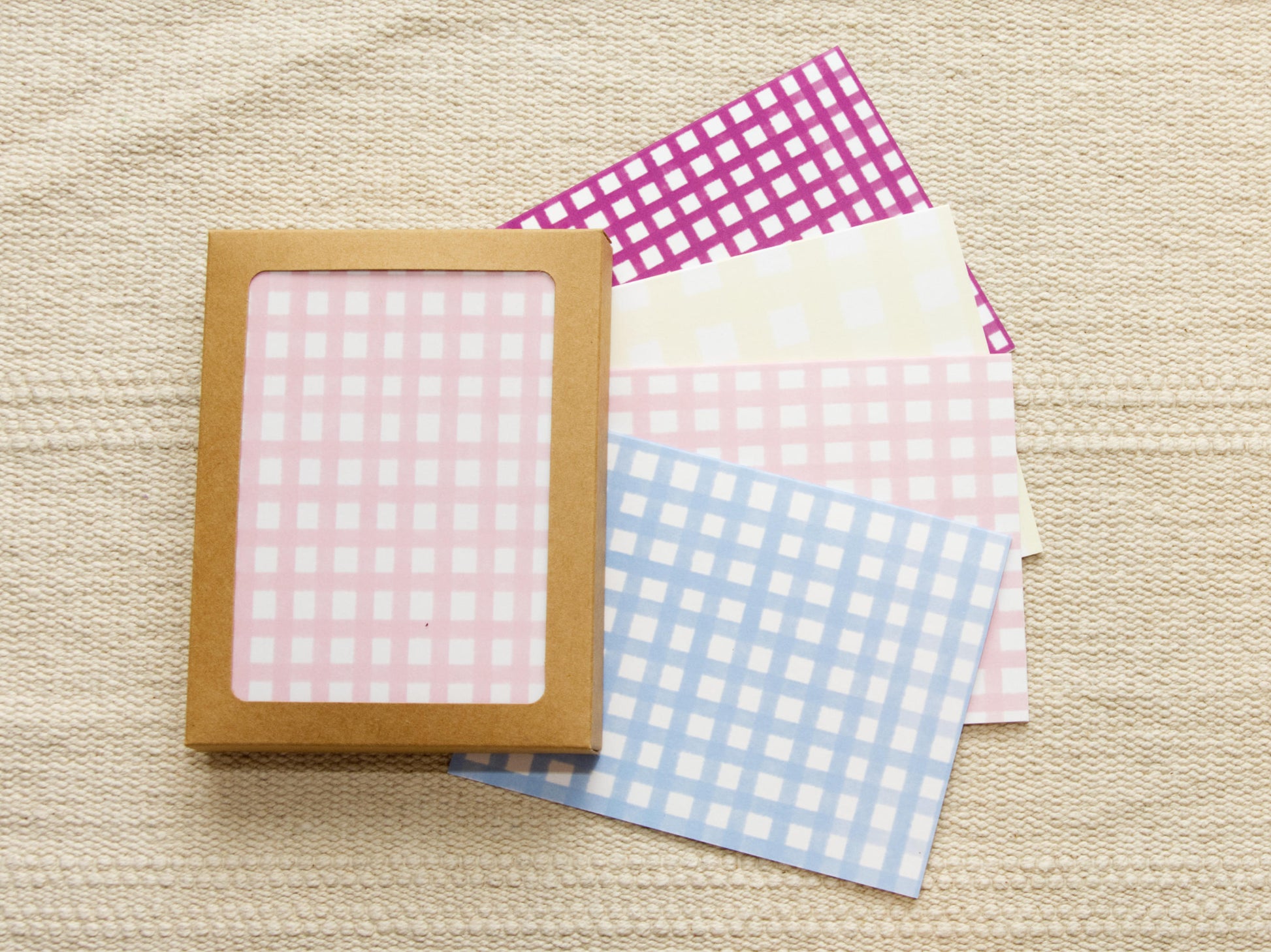 These colorful, cheerful note cards are perfect for your own collection or to give as a gift! This boxed set of 12 notecards includes three each of four bright watercolor gingham designs. 12 envelopes are included, and the whole set comes in a brown kraft box with a clear window. They have the same pattern on the front and the back of the card and can be used in landscape or portrait orientation.